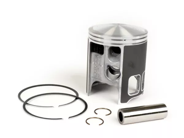 The piston manufactured by Vertex has a molybdenum sulphide anti-friction coating on the piston skirt. The new piston has 2 piston rings and is shorter. Therefore it can be used with 60mm long stroke shafts without any modification to the piston. Furthermore the windows in the piston have been enlarged to fit better to the scavenging layout of the cylinder.