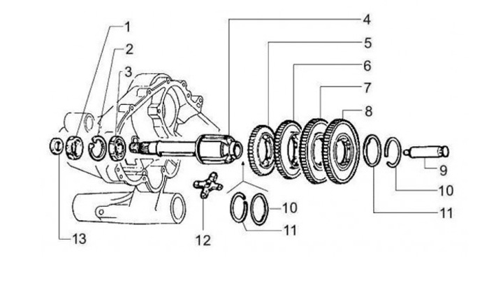 Completely assembled gearbox (drive shaft, gears, shift cross) -BGM PRO- Vespa Largeframe (1984-) - PX Lusso, Disc, My, 2011, Cosa, T5 125cc, LML Star 2-stroke, Stella 2-stroke - 12/57, 13/42, 17/38, 21/36 teeth - short fourth gear