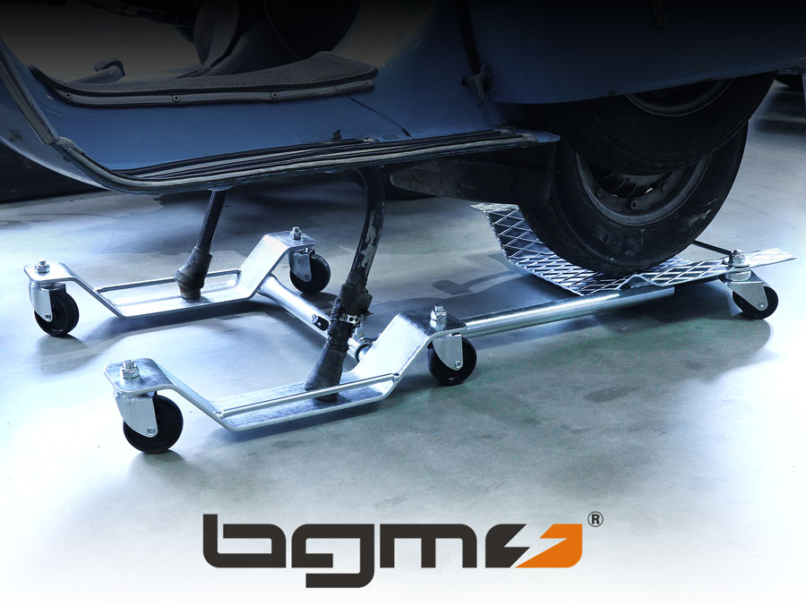 Vespa en Lambretta tandwiel scooters is gemaakt van robuust, gegalvaniseerd staal. Dankzij de twee gemonteerde dubbele rollen kun je je scooter ter plekke draaien met dit