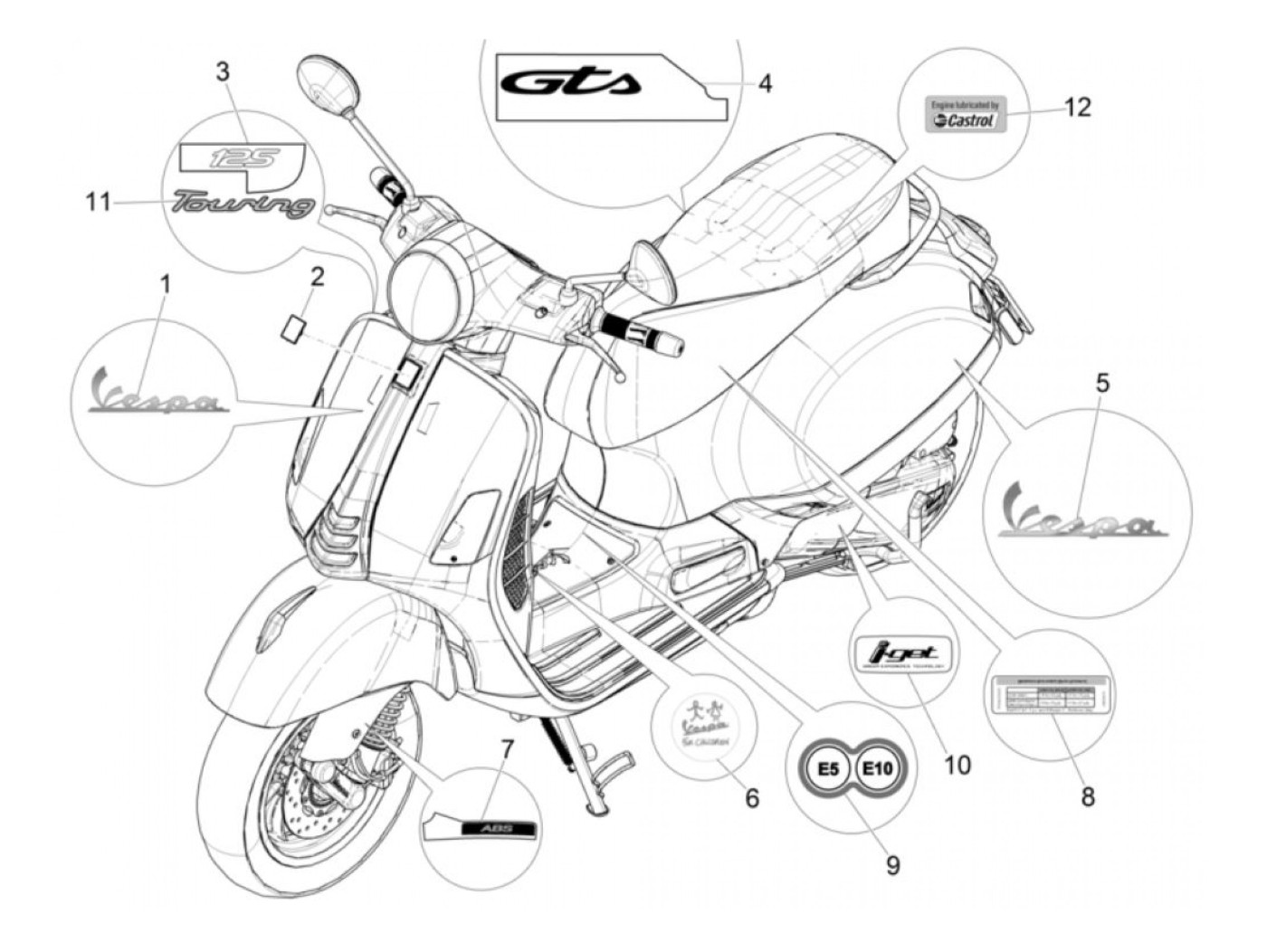 Rotulación -PIAGGIO- Vespa para niños - Vespa GTS 125 (ZAPMA3100, ZAPMA3200, ZAPMA3700), Vespa GTS 150 (ZAPMA3200, ZAPMA3100), Vespa GTS 250 (ZAPM45100), Vespa GTS 300 (ZAPM45200, ZAPM45202, ZAPMA3300), Vespa GTS HPE 300 (ZAPMA3600), Vespa GTS Super 1