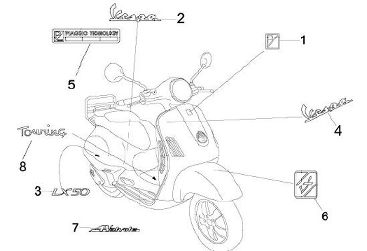 Rotulación del maletero -PIAGGIO- Touring - Vespa GTS 300 (ZAPM45200, ZAPM45202), Vespa GTS Super 125 (ZAPMA3100, ZAPMA3200), Vespa GTS Super 300 (ZAPM45200, ZAPMA3300), Vespa LX 125 (ZAPM68300, ZAPM68100, ZAPM68303), Vespa LX 150 (ZAPM68400), Vespa LX 50
