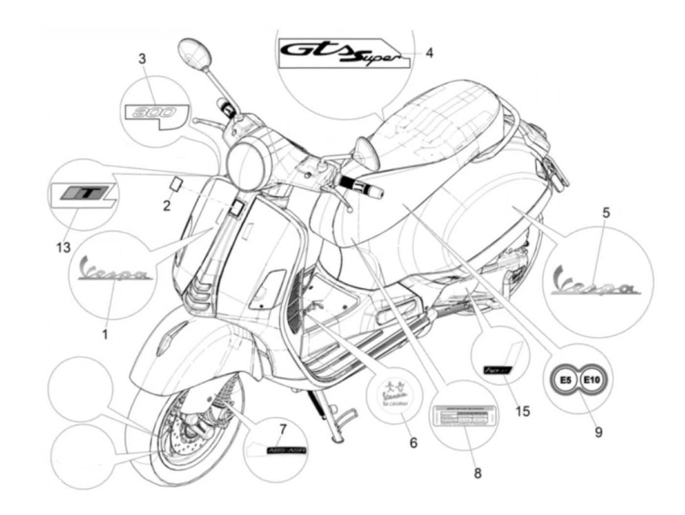 Rotulación -PIAGGIO- Vespa para niños - Vespa GTS 125 (ZAPMA3100, ZAPMA3200, ZAPMA3700), Vespa GTS 150 (ZAPMA3200, ZAPMA3100), Vespa GTS 250 (ZAPM45100), Vespa GTS 300 (ZAPM45200, ZAPM45202, ZAPMA3300), Vespa GTS HPE 300 (ZAPMA3600), Vespa GTS Super 1