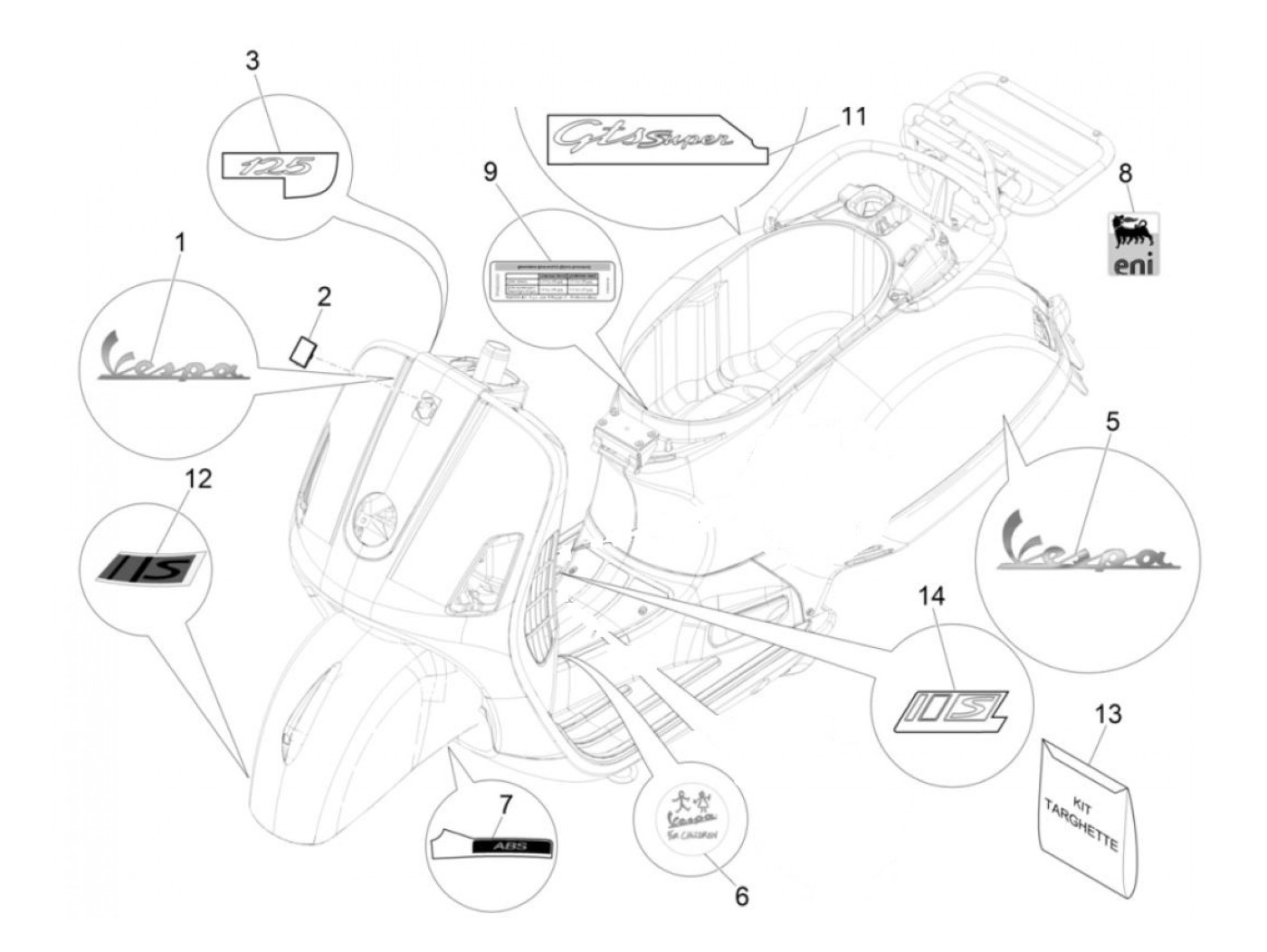 Rotulación -PIAGGIO- Vespa para niños - Vespa GTS 125 (ZAPMA3100, ZAPMA3200, ZAPMA3700), Vespa GTS 150 (ZAPMA3200, ZAPMA3100), Vespa GTS 250 (ZAPM45100), Vespa GTS 300 (ZAPM45200, ZAPM45202, ZAPMA3300), Vespa GTS HPE 300 (ZAPMA3600), Vespa GTS Super 1