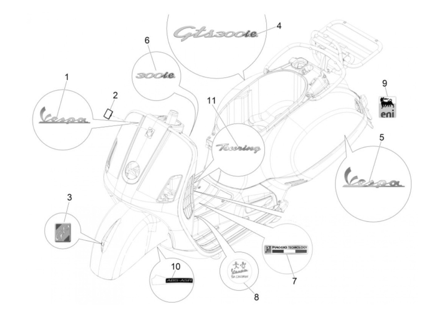 Rotulación -PIAGGIO- Vespa para niños - Vespa GTS 125 (ZAPMA3100, ZAPMA3200, ZAPMA3700), Vespa GTS 150 (ZAPMA3200, ZAPMA3100), Vespa GTS 250 (ZAPM45100), Vespa GTS 300 (ZAPM45200, ZAPM45202, ZAPMA3300), Vespa GTS HPE 300 (ZAPMA3600), Vespa GTS Super 1