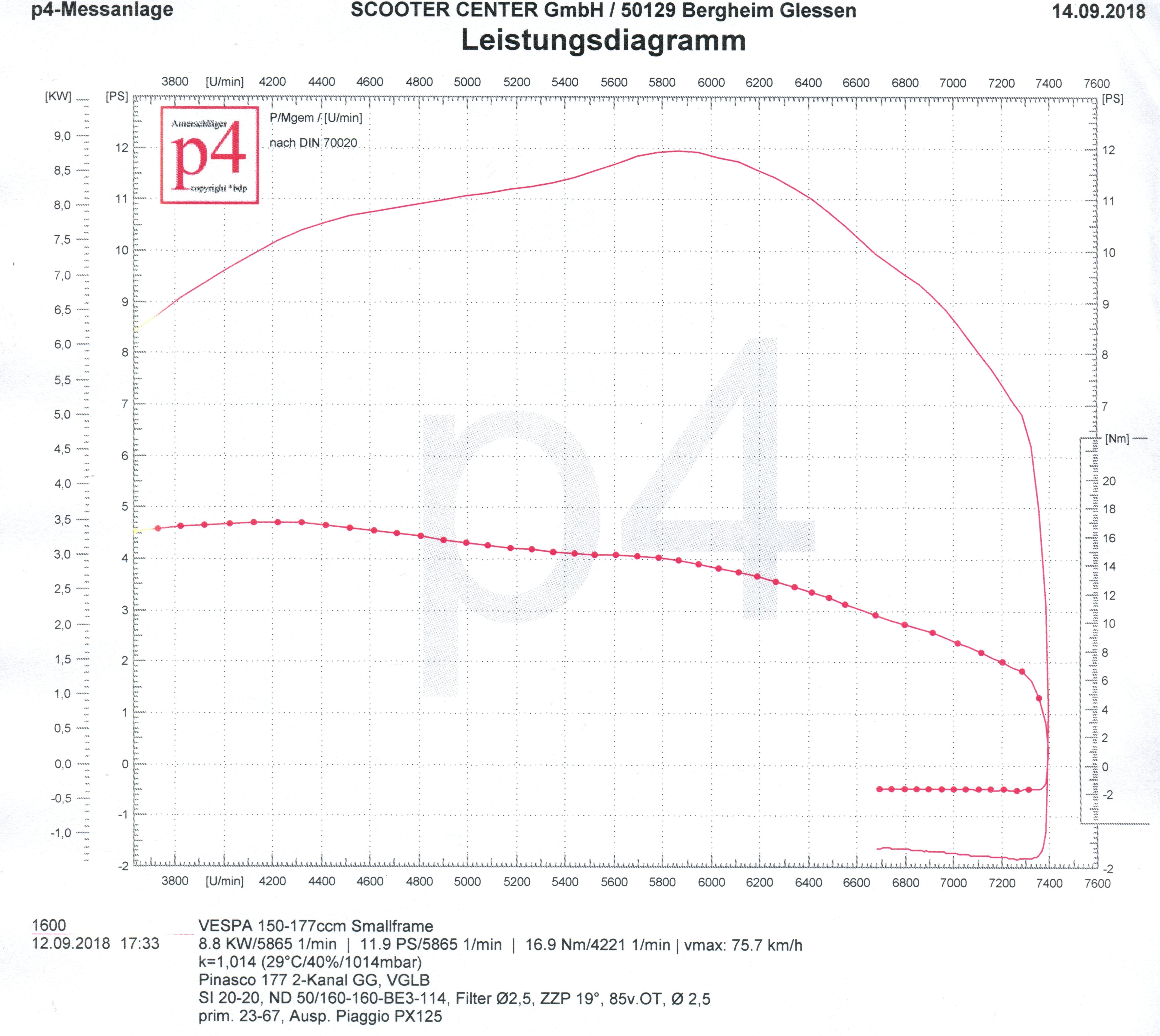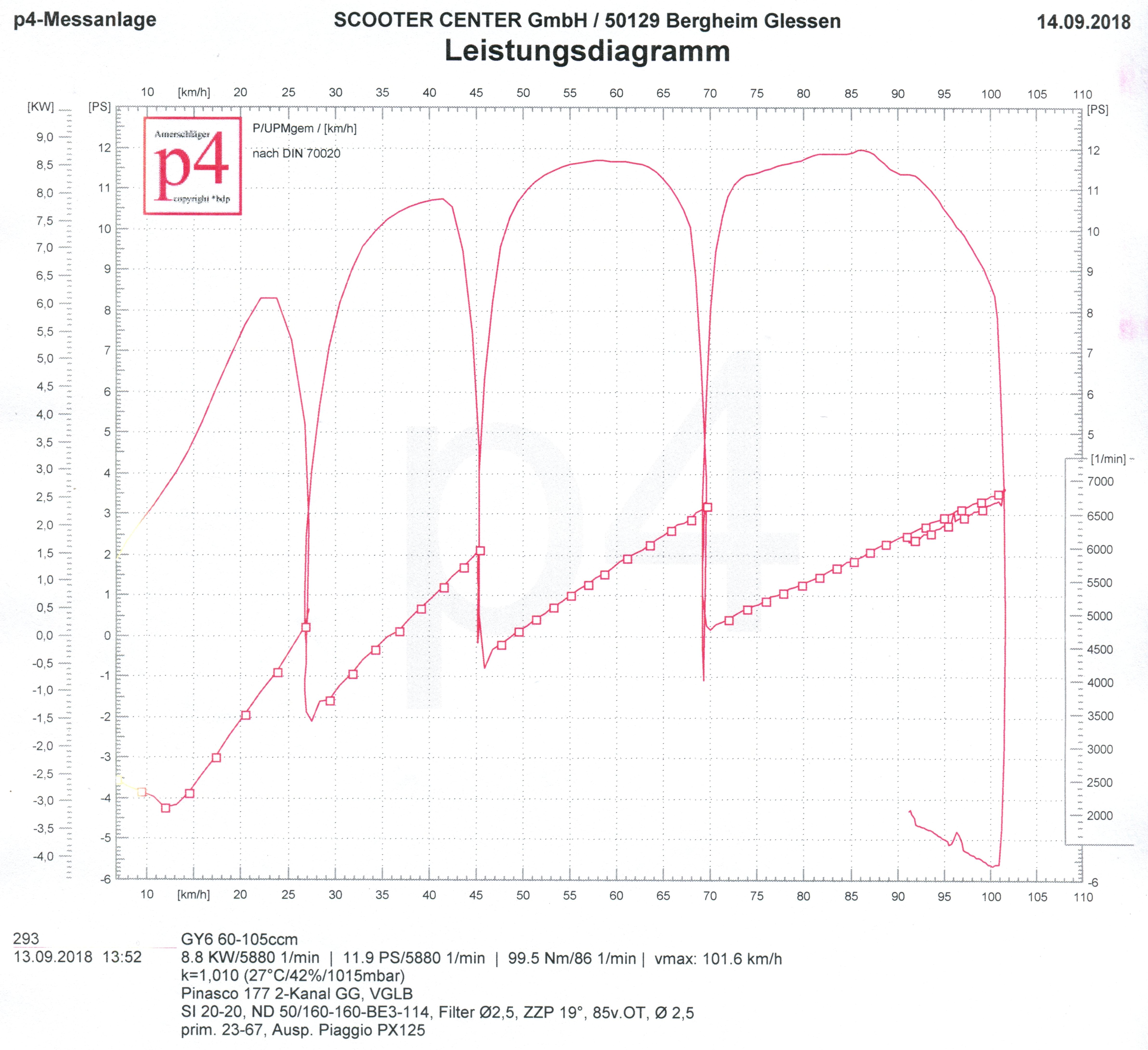 La ventaja del ángulo de admisión asimétrico aún no ha sido aprovechada por Piaggio. Si el orificio de admisión en el cárter del motor se abre antes, el motor se beneficia tanto en términos de par como de suavidad de marcha (el motor ya no golpea al avanzar por inercia). Con este fin, la admisión se retoca (fresa) a aprox. 110° v.Ot. ángulo de admisión.