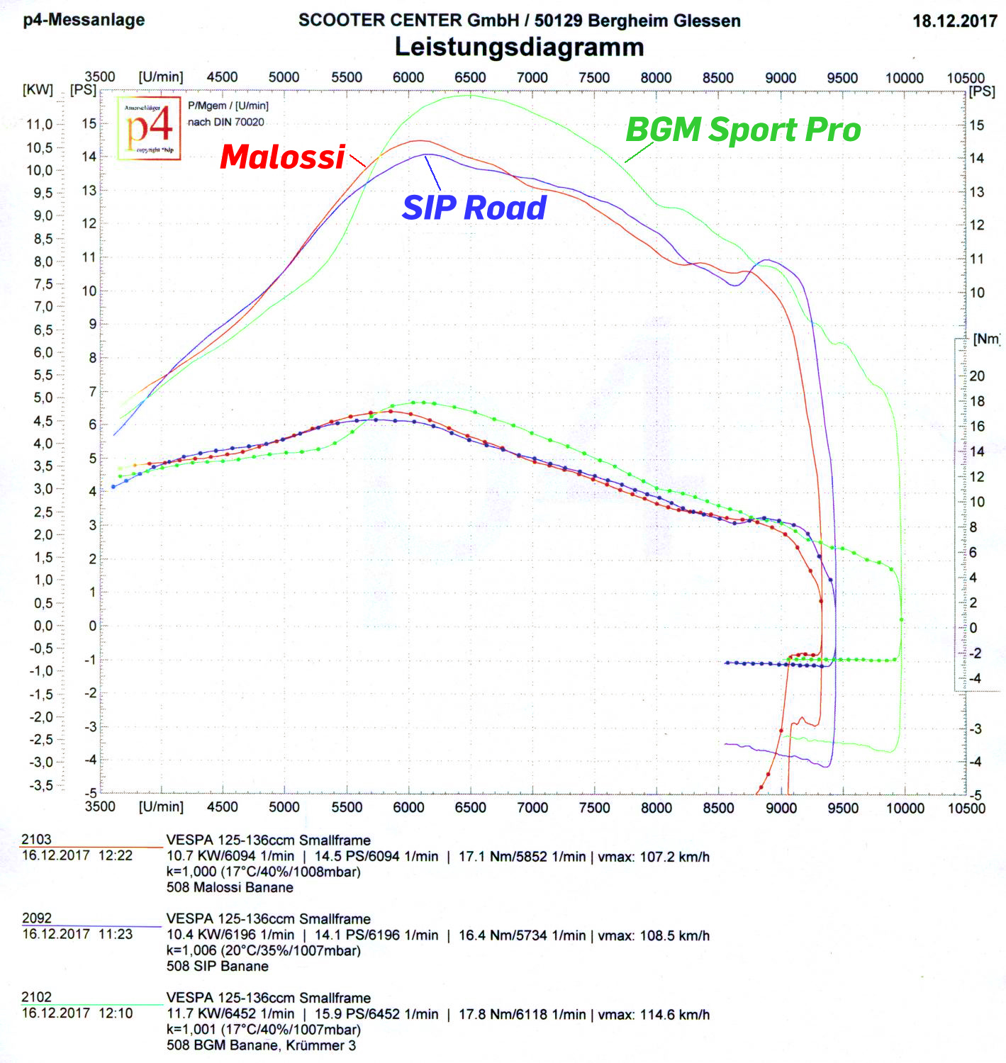 El BGM Pro Banana en la versión SPORT ofrece un aspecto discreto con los valores de rendimiento de un escape de carreras. Comienza a resonar a partir de aproximadamente 5000 rpm y luego empuja hacia adelante con mucha fuerza. Por lo tanto, es actualmente el sistema de escape más potente disponible en el característico diseño en forma de plátano del escape estándar de los modelos Vespa ET3.