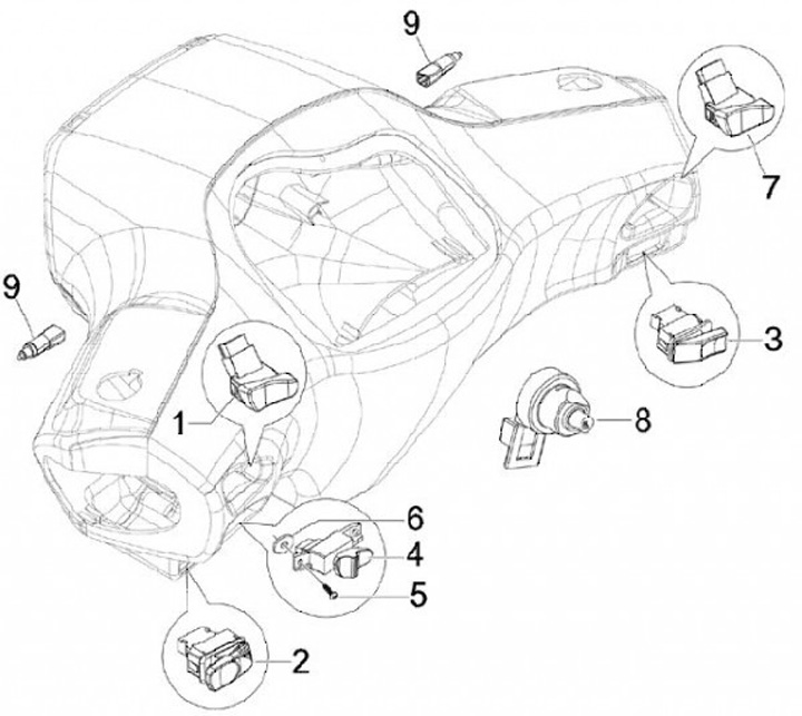 Interruptor indicador -PIAGGIO- Vespa GT L 125 (ZAPM31100, ZAPM31101), Vespa GT L 200 (ZAPM31200), Vespa GTS 125 (ZAPM31300), Vespa GTS 250 (ZAPM45100, ZAPM45101), Vespa GTS 300 (ZAPM45200), Vespa GTS Super 125 (ZAPM45300), Vespa GTS Super 300 (ZAPM45200)