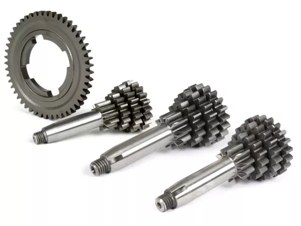 El eje auxiliar que se ofrece aquí para los motores smallframe de Vespa (por ejemplo, PV125, ET3, PK) tiene una relación de transmisión más deportiva que la original. La cuarta e incluso la tercera marcha tienen una relación de reducción más corta, lo que significa que los saltos de marcha son más pequeños y el motor permanece en el rango de potencia total después del cambio. Por lo tanto, es ideal para motores potentes cuyo régimen debe mantenerse constantemente alto para desarrollar siempre toda la propulsión.
