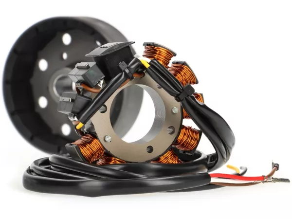 Gracias a los 12 imanes en la rueda de polos y las 9 bobinas en la placa base de encendido, se dispone de una alta salida de corriente incluso a bajas revoluciones del motor y la luz ya no parpadea cuando el motor está al ralentí. La potencia máxima del alternador es de 110 vatios.