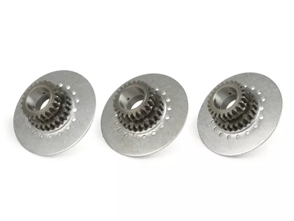 El rango de revoluciones de los cilindros Polini está casi en el mismo rango que el motor original. Así que si quieres ir mucho más rápido que el original con la potencia significativamente mayor y el rico par de estos cilindros, deberías elegir al menos un piñón de embrague de 24 dientes para el engranaje primario original de dientes helicoidales (65 dientes) o, si el motor tiene que ser reconstruido para un cigüeñal diferente de todos modos, instalar el piñón DRT de dientes rectos con 62 dientes. Debido al dentado recto, no hay más fuerzas laterales que actúen sobre los cojinetes y el asiento del eje auxiliar. Esta es siempre una buena elección para motores de alto par con el fin de proteger el material. Se puede elegir entre tres piñones de embrague diferentes (23/24/25) que se pueden combinar con el engranaje primario de 62 dientes. De este modo, incluso un vaporizador de par puede moverse con suficiente rapidez sin sobrerrevolucionar.