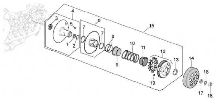 Convertidor con embrague -PIAGGIO- Vespa ET4 125, LX 125, LXV 125, S 125, Piaggio Fly 125, Liberty 125, Skipper 125, TPH 125, Zip II 125, X8 125, Aprilia Mojito 125, SR Motard 125, Sport City One 125, Derbi Boulevard 125