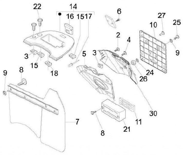 Tapa detrás del compartimento del casco -PIAGGIO- Vespa ET4 (ZAPM04, ZAPM19, ZAPC26), Vespa LX (ZAPC38, ZAPM44,ZAPM68), Vespa LXV (ZAPC38, ZAPM44,ZAPM68), Vespa S (ZAPC38, ZAPM44,ZAPM68)