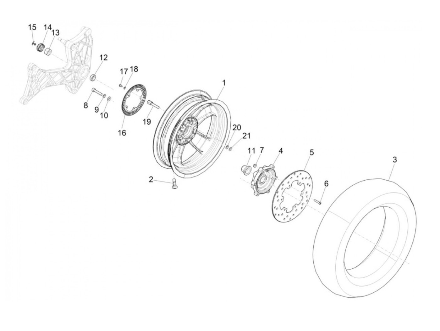 Llanta -PIAGGIO GTS125/300 Super Sport, HPE, Supertech, Notte - plata, (3.00x12) - 5 radios - para Vespa GTS, HPE 125/300cc - trasera (2017-, Llanta de tono ABS atornillada a la llanta)