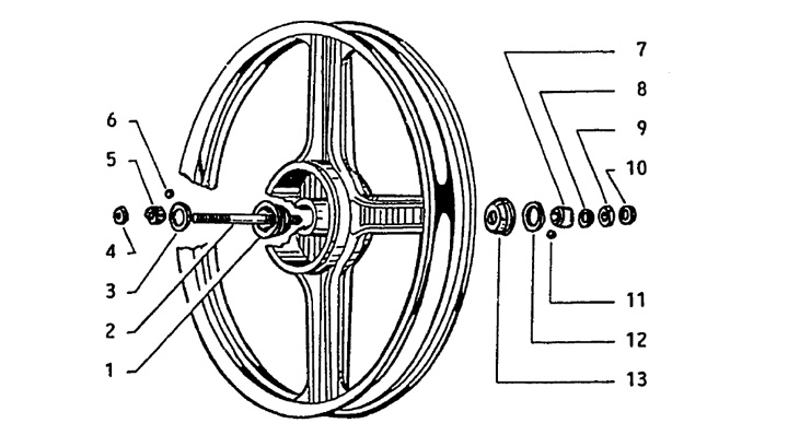 Axe de roue avant avec cônes, roulements et écrous -CIF Ø11mm, L=200mm- Piaggio Ciao, SI FL2, Boss, Grillo, Superbravo