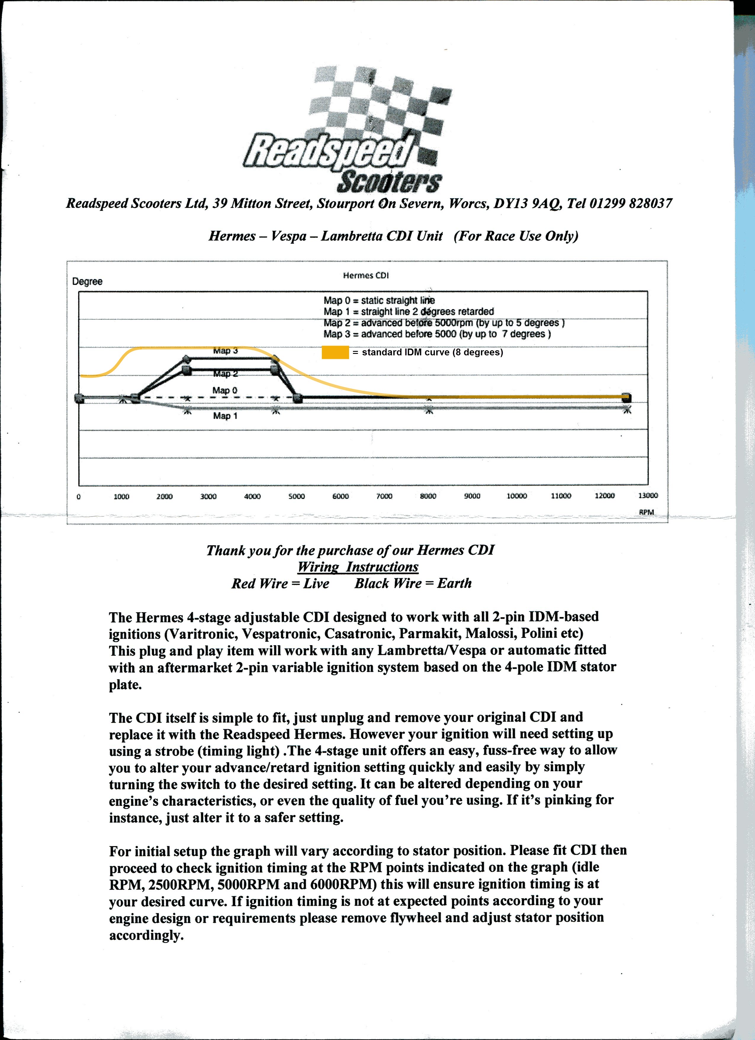 Le CDI réglable à 4 niveaux Hermes est conçu pour fonctionner avec toutes les allumages de type IDM à 2 broches (Varitronic, Vespatronic, Casatronic, Casatronic, Parmakit, Malossi, Polini, Pinasco Flytech, etc).