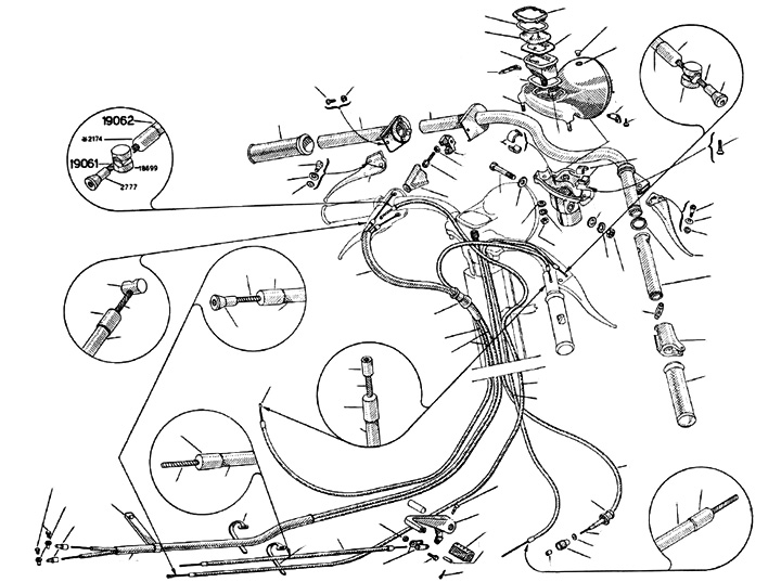 Support câbles de vitesse pour guidon -Mauro Pascoli , sans vis tendeurs- Vespa Wideframe V30T-V33T, VM1T, VN1T, Vespa 150 VL1T-3T, VS1T