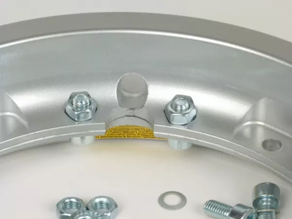 Si le joint torique est bien positionné, tu peux poser la petite moitié de la jante. Les deux moitiés sont maintenant assemblées avec 10 vis. Pinasco indique à cet effet un couple maximal de 18Nm. Dans la grande moitié de la jante, les écrous sont maintenus par complémentarité de forme. La tête de la vis à six pans creux est protégée contre un desserrage automatique par une rondelle d'arrêt.