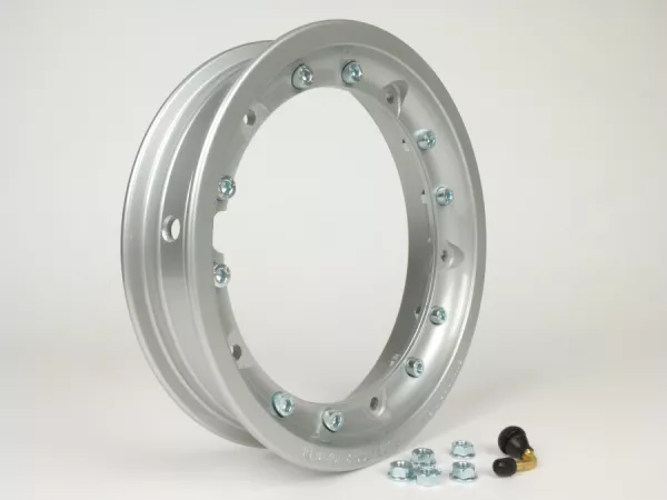 Jante -PINASCO, V2.0, sans chambre à air 2.10-10 aluminium, séparable- Vespa (type PX) - argentJante -PINASCO, V2.0, sans chambre à air 2.10-10 aluminium, séparable- Vespa (type PX) - aluminium poliJante -PINASCO, V2.0, sans chambre à air 2.10-10 aluminium, séparable- Vespa (type PX) - noirMontage de la jante Vespa
