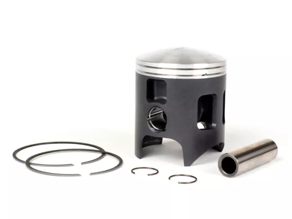 Kit complet de pistons comprenant : Piston, deux segments de piston en acier de 1 mm d'épaisseur, goujon et clips.