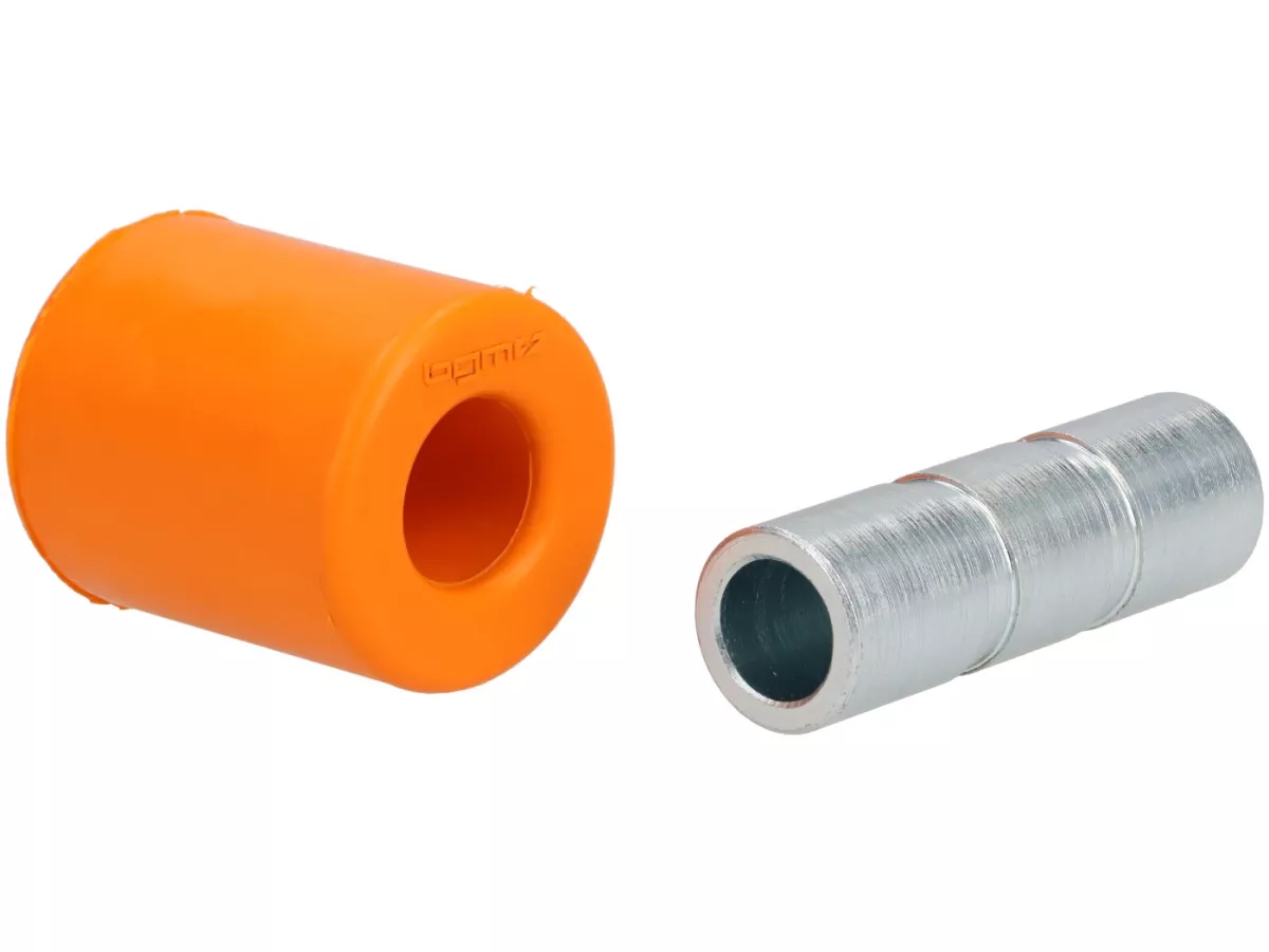Pour garantir une absorption durable des vibrations entre le moteur et l’amortisseur, nous avons fait fabriquer ici en Allemagne des silentblocs en caoutchouc EPDM. Ce matériau résiste durablement à tout ce que peut rencontrer un scooter au quotidien : huile, graisse, essence, ozone ambiant et rayons du soleil. En matière de silentblocs, nous avons tout prévu. Il ne manquait plus qu’une solution pour que le caoutchouc maintienne durablement la douille au centre – et empêche ainsi tout contact entre amortisseur et carter moteur.