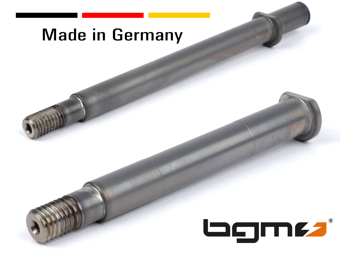 Un mot difficile à lire et pourtant si important. Ce composant relie le tube de direction en acier (également appelé tube de direction ou fourche) au bras oscillant en aluminium. Ce dernier guide la roue et relie également l'amortissement/la suspension au tube de direction. Toute force de la roue, tout mouvement de direction, tout mouvement de montée et de descente de la roue est transmis par cet axe. Pour répondre non seulement à toutes ces exigences, mais aussi aux exigences actuelles, nous faisons fabriquer les axes de bras oscillant BGM PRO dans un acier premium très résistant (1.4112, référence alternative X90CrMoV18). Nous attachons une grande importance au respect précis des dimensions. Les axes sont tournés à une qualité de surface de 0,2-0,4RA :