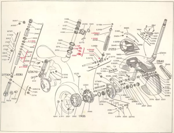 La suspension unilatérale permet un démontage rapide des roues, dispose de moins de pièces qu'un guidage bilatéral et est en outre conçue de manière si solide que même les générations suivantes peuvent continuer à utiliser le matériel et le soumettre souvent à des contraintes bien plus importantes que celles prévues à l'époque. Qui aurait pensé, lors de la conception du bras oscillant avant dans le bureau d'études de Piaggio, que 60 ans plus tard( !), des personnes rouleraient encore avec ce matériau deux fois plus vite et avec une puissance moteur parfois 5 à 6 fois supérieure ? Difficile d'imaginer que dans 60 ans, quelqu'un conduira une Vespa GTS300 actuelle avec 100 CV et 240 km/h, n'est-ce pas ? Si tout cela fonctionne à merveille, c'est grâce à la clairvoyance technique des constructeurs Piaggio, qui travaillaient encore avec les critères de l'époque en matière de qualité des produits et de multiples garanties concernant les dimensions des composants. Ainsi, les anciennes pièces d'origine Piaggio sont encore aujourd'hui une 'banque' en termes de précision dimensionnelle et de résistance (un fait qui n'est malheureusement plus applicable à 100% aux pièces d'origine actuelles).