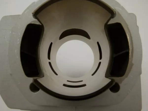 Au premier coup d'œil, la conception des canaux de suralimentation dans le cylindre présente une ressemblance frappante avec le Polini Evolution. Mais en y regardant de plus près, tu découvriras des différences dans la conception. Les angles des surfaces d'entrée sont très différents. Grâce à la hauteur des canaux d'échappement et de suralimentation et à un recul du piston supposé de 0 mm, on obtient des angles de commande déjà assez sportifs de 125°/185°. Contrairement aux autres cylindres, les ouvertures des canaux de suralimentation sont déjà ouvertes dans le pied du cylindre. Le pied de cylindre a un diamètre de 61,3 mm, il n'est donc pas nécessaire d'agrandir l'alésage du pied de cylindre dans le boîtier du moteur.