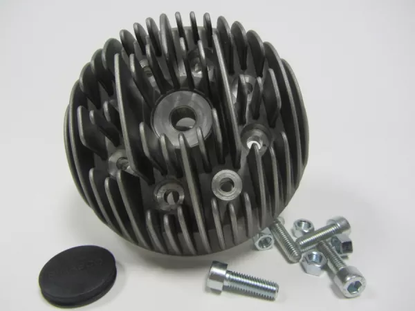 Sur cette culasse moulée assez massive, on remarque tout d'abord la face inférieure entièrement usinée. La chambre de combustion avec la position centrale de la bougie d'allumage est décalée d'environ 1 mm. Le contour extérieur de la surface d'étanchéité permet de centrer la culasse sur le cylindre. Un joint de culasse n'est pas prévu. Grâce à la culasse vissée 8 fois et à la surface d'étanchéité largement dimensionnée, une étanchéité durable et fiable devrait être garantie, même sans éléments d'étanchéité supplémentaires. Pinasco recommande un couple de serrage de 12Nm pour les goujons cylindriques ainsi que pour les vis supplémentaires M8x25 sur la culasse.