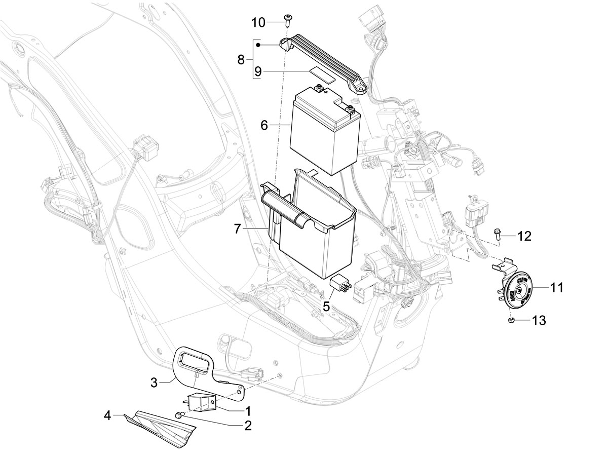 Tempat baterai -PIAGGIO- Vespa Primavera 125 (RP8M82100, RP8M82310, RP8M82500, RP8M82821), Vespa Sprint 150 (ZAPMA1400, ZAPMA1401, ZAPMD1201), Vespa Elettrica Elektro (ZAPCB0100, ZAPCB0101, ZAPCB103, ZAPMA9100, ZAPMA9101, ZAPMA9102, ZAPMA9EB)
