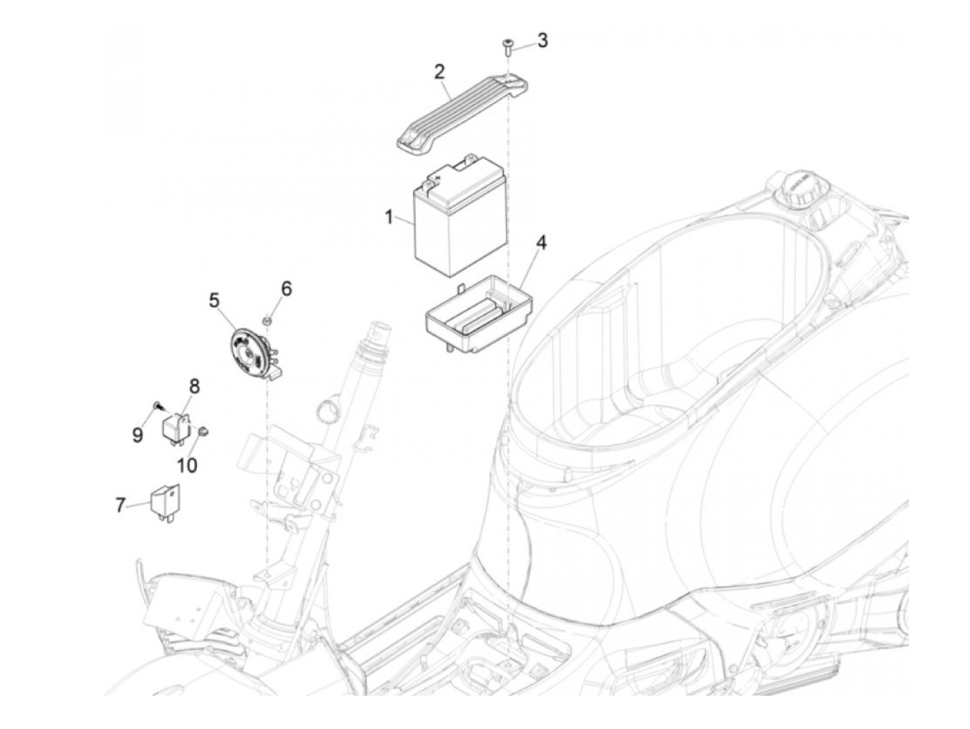 Tempat baterai -PIAGGIO- Vespa GT 250 (ZAPM45102), Vespa GT L 125 (ZAPM31100, ZAPM31101), Vespa GT L 200 (ZAPM31200), Vespa GTS 125 (ZAPM31300, ZAPMA3100, ZAPMA3200, ZAPMA3700), Vespa GTS 150 (ZAPMA3200, ZAPMA3100), Vespa GTS 250 (ZAPM45100, ZAPM45101)