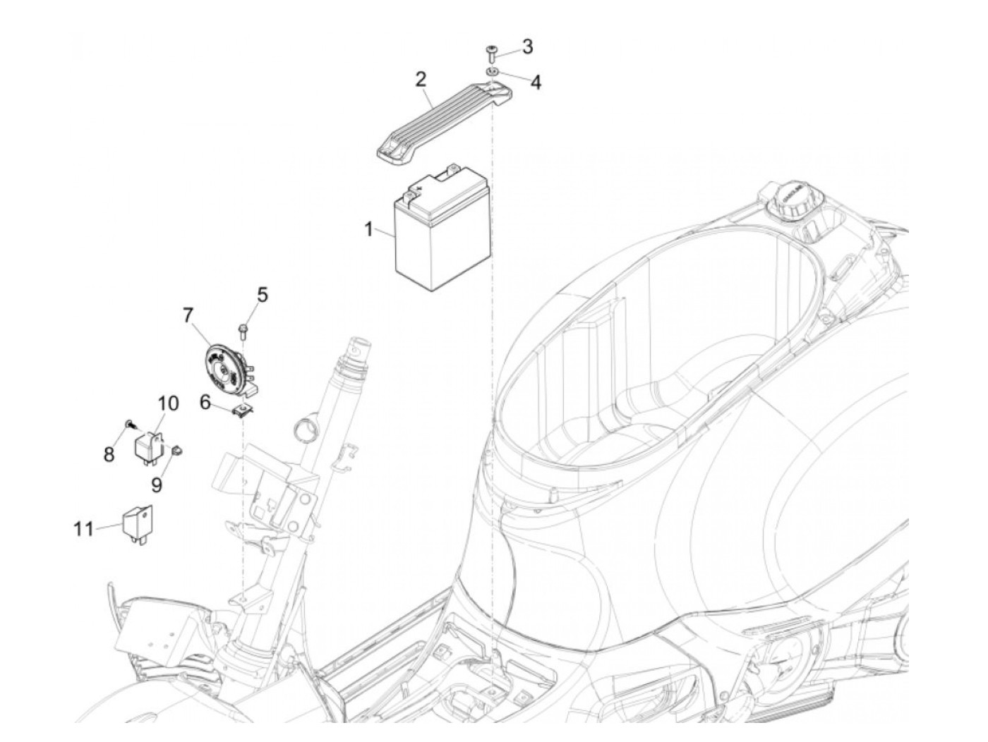 Tempat baterai -PIAGGIO- Vespa GT 250 (ZAPM45102), Vespa GT L 125 (ZAPM31100, ZAPM31101), Vespa GT L 200 (ZAPM31200), Vespa GTS 125 (ZAPM31300, ZAPMA3100, ZAPMA3200, ZAPMA3700), Vespa GTS 150 (ZAPMA3200, ZAPMA3100), Vespa GTS 250 (ZAPM45100, ZAPM45101)