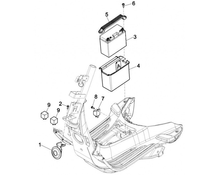 Tempat baterai -PIAGGIO- Vespa Primavera 125 (RP8M82100, RP8M82310, RP8M82500, RP8M82821), Vespa Sprint 150 (ZAPMA1400, ZAPMA1401, ZAPMD1201), Vespa Elettrica Elektro (ZAPCB0100, ZAPCB0101, ZAPCB103, ZAPMA9100, ZAPMA9101, ZAPMA9102, ZAPMA9EB)