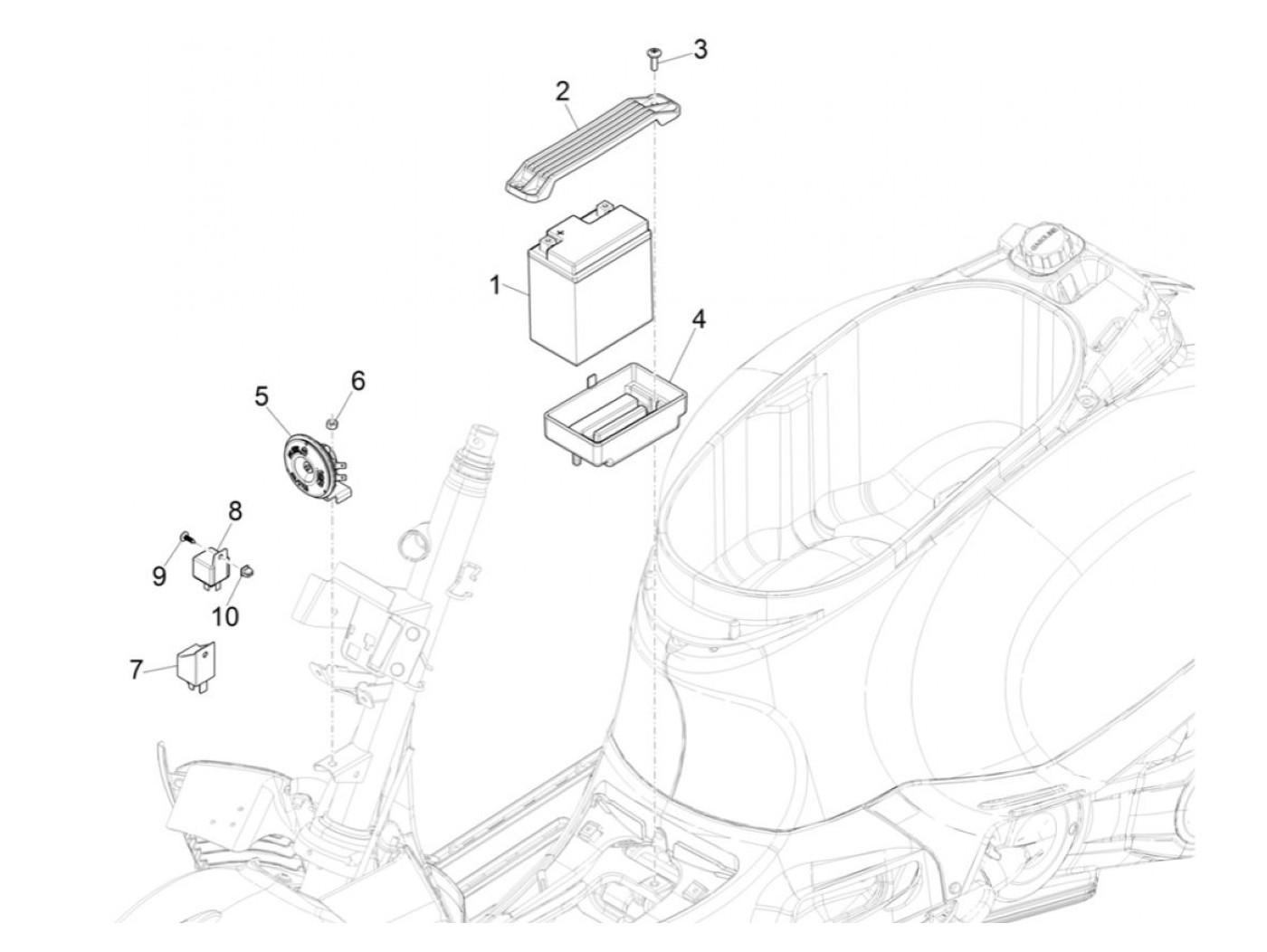 Tempat baterai -PIAGGIO- Vespa GT 250 (ZAPM45102), Vespa GT L 125 (ZAPM31100, ZAPM31101), Vespa GT L 200 (ZAPM31200), Vespa GTS 125 (ZAPM31300, ZAPMA3100, ZAPMA3200, ZAPMA3700), Vespa GTS 150 (ZAPMA3200, ZAPMA3100), Vespa GTS 250 (ZAPM45100, ZAPM45101)