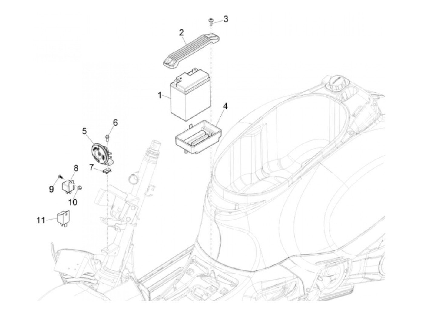Tempat baterai -PIAGGIO- Vespa GT 250 (ZAPM45102), Vespa GT L 125 (ZAPM31100, ZAPM31101), Vespa GT L 200 (ZAPM31200), Vespa GTS 125 (ZAPM31300, ZAPMA3100, ZAPMA3200, ZAPMA3700), Vespa GTS 150 (ZAPMA3200, ZAPMA3100), Vespa GTS 250 (ZAPM45100, ZAPM45101)