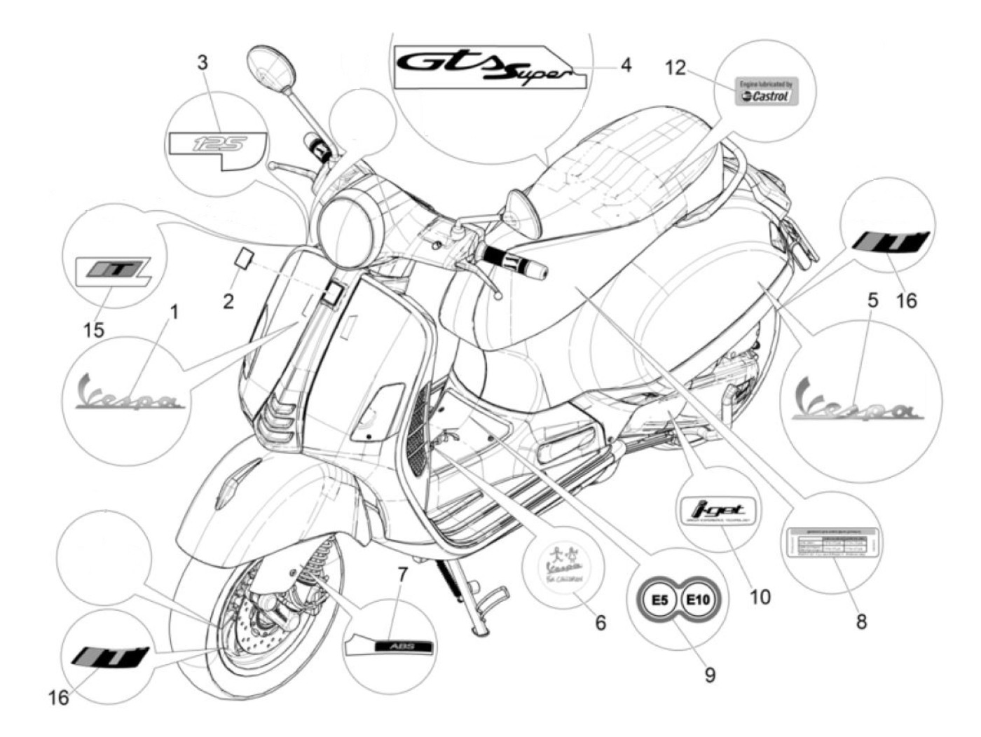 Huruf -PIAGGIO- Vespa untuk anak-anak - Vespa GTS 125 (ZAPMA3100, ZAPMA3200, ZAPMA3700), Vespa GTS 150 (ZAPMA3200, ZAPMA3100), Vespa GTS 250 (ZAPM45100), Vespa GTS 300 (ZAPM45200, ZAPM45202, ZAPMA3300), Vespa GTS HPE 300 (ZAPMA3600), Vespa GTS Super 1