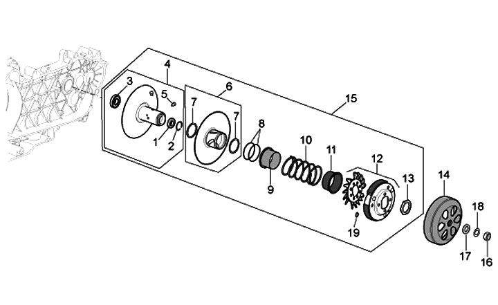 Kopling -PIAGGIO- Vespa ET4 125 (ZAPM19000), Vespa ET4 150 (ZAPM19000), Vespa GT L 125 (ZAPM31100, ZAPM31101), Vespa GTS 125 (ZAPM31300), Vespa GTS Super 125 (ZAPM45300), Vespa GTV 125 (ZAPM31301), Vespa LX 125 (ZAPM44100, ZAPM44300), Vespa LX 150 (ZAPM4