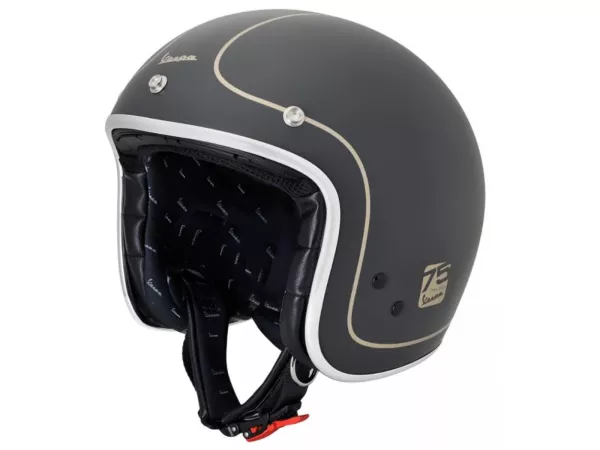 Helm jet klasik dengan tiga kancing tekan sangat menarik perhatian. Cangkang helm terbuat dari termoplastik dan helm memiliki pengikat ratchet. Pinggiran berlapis krom, lapisan dalam dengan logo Vespa, cat abu-abu berasap, dan grafis kuning dengan logo Vespa membuat helm ini menonjol. Cakupan pengiriman termasuk tas helm eksklusif dengan logo ulang tahun, yang bergaya dan praktis. Kualitas dan kenyamanan helm ini dijamin oleh label Made in Italy. Homologasi ECE 22.05.