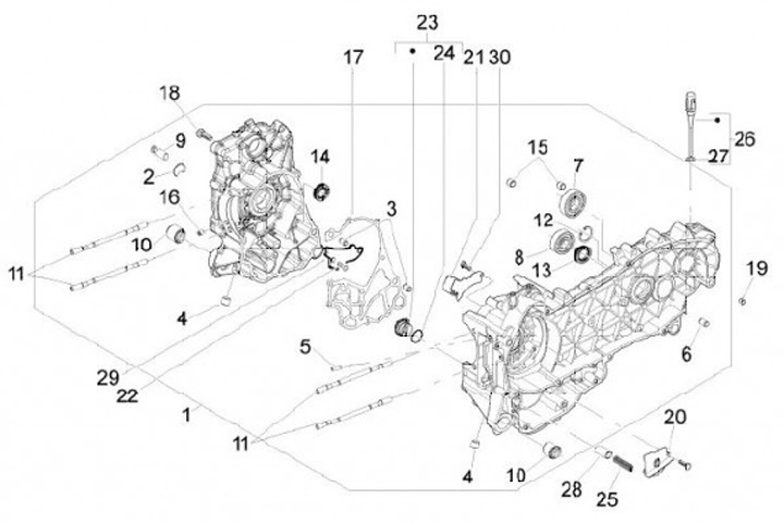 Gasket rumah mesin -PIAGGIO- Vespa GT 250 (ZAPM45102), Vespa GT L 125 (ZAPM31101), Vespa GT L 200 (ZAPM31200), Vespa GTS 125 (ZAPM31300), Vespa GTS 250 (ZAPM45100, ZAPM45101), Vespa GTS 300 (ZAPM45200, ZAPM45202, ZAPMA3300), Vespa GTS HPE 300 (ZAPMD310)