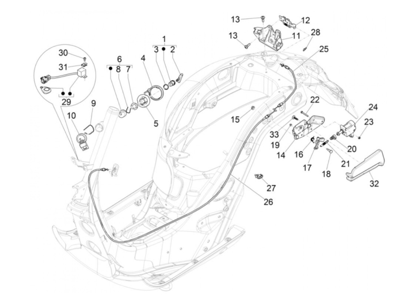 Kunci bangku kursi -PIAGGIO- Vespa GT 250 (ZAPM45102), Vespa GT L 125 (ZAPM31100, ZAPM31101), Vespa GT L 200 (ZAPM31200), Vespa GTS 125 (ZAPM31300, ZAPMA3100, ZAPMA3200, ZAPMA3700), Vespa GTS 150 (ZAPMA3200, ZAPMA3100), Vespa GTS 250 (ZAPM45100, ZAPM45101