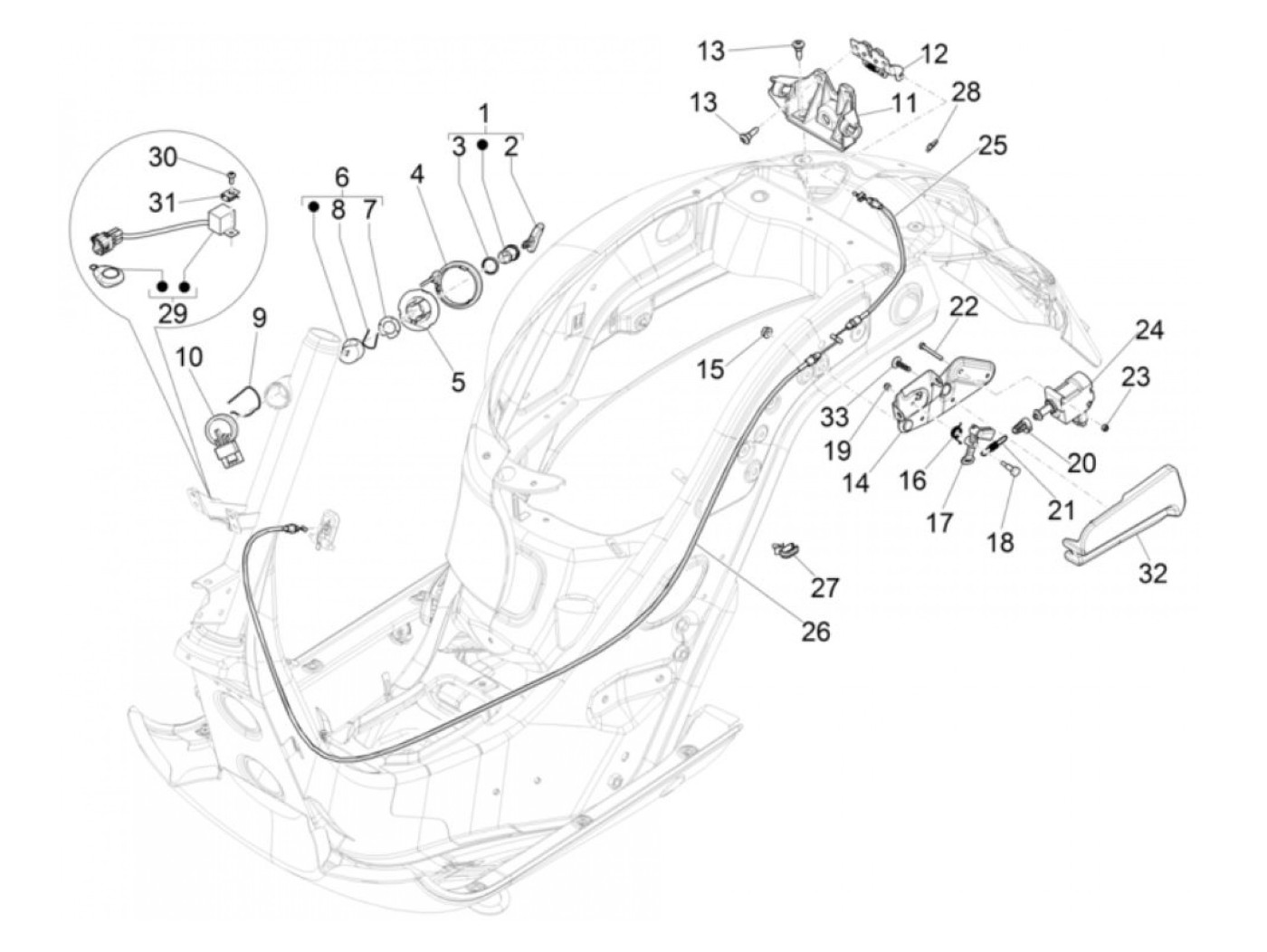 Kunci bangku kursi -PIAGGIO- Vespa GT 250 (ZAPM45102), Vespa GT L 125 (ZAPM31100, ZAPM31101), Vespa GT L 200 (ZAPM31200), Vespa GTS 125 (ZAPM31300, ZAPMA3100, ZAPMA3200, ZAPMA3700), Vespa GTS 150 (ZAPMA3200, ZAPMA3100), Vespa GTS 250 (ZAPM45100, ZAPM45101