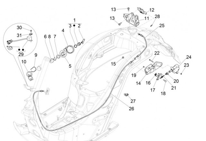 Kunci bangku kursi -PIAGGIO- Vespa GT 250 (ZAPM45102), Vespa GT L 125 (ZAPM31100, ZAPM31101), Vespa GT L 200 (ZAPM31200), Vespa GTS 125 (ZAPM31300, ZAPMA3100, ZAPMA3200, ZAPMA3700), Vespa GTS 150 (ZAPMA3200, ZAPMA3100), Vespa GTS 250 (ZAPM45100, ZAPM45101