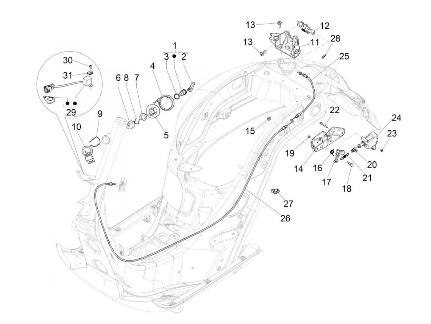 Kunci bangku kursi -PIAGGIO- Vespa GT 250 (ZAPM45102), Vespa GT L 125 (ZAPM31100, ZAPM31101), Vespa GT L 200 (ZAPM31200), Vespa GTS 125 (ZAPM31300, ZAPMA3100, ZAPMA3200, ZAPMA3700), Vespa GTS 150 (ZAPMA3200, ZAPMA3100), Vespa GTS 250 (ZAPM45100, ZAPM45101
