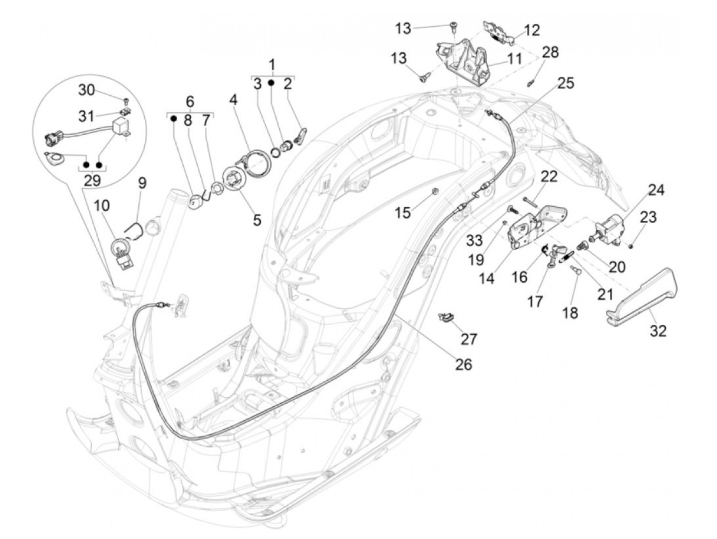 Kunci bangku kursi -PIAGGIO- Vespa GT 250 (ZAPM45102), Vespa GT L 125 (ZAPM31100, ZAPM31101), Vespa GT L 200 (ZAPM31200), Vespa GTS 125 (ZAPM31300, ZAPMA3100, ZAPMA3200, ZAPMA3700), Vespa GTS 150 (ZAPMA3200, ZAPMA3100), Vespa GTS 250 (ZAPM45100, ZAPM45101