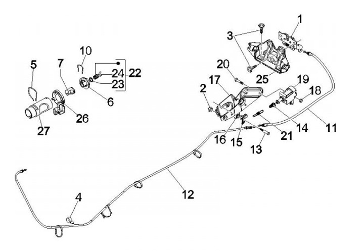 Kabel tarik (panjang) untuk kunci bangku jok -PIAGGIO- Vespa GT 250 (ZAPM45102), Vespa GT L 125 (ZAPM31100, ZAPM31101), Vespa GT L 200 (ZAPM31200), Vespa GTS 125 (ZAPM31300, ZAPMA3100, ZAPMA3200, ZAPMA3700), Vespa GTS 150 (ZAPMA3200, ZAPMA3100), Vespa GTS