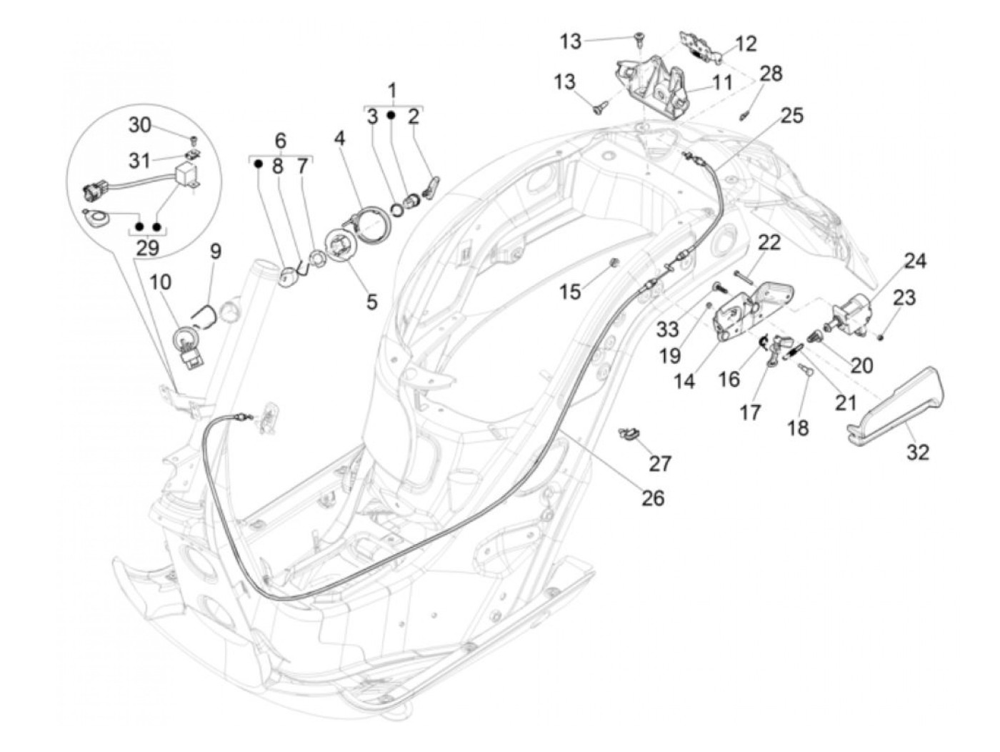 Kunci bangku kursi -PIAGGIO- Vespa GT 250 (ZAPM45102), Vespa GT L 125 (ZAPM31100, ZAPM31101), Vespa GT L 200 (ZAPM31200), Vespa GTS 125 (ZAPM31300, ZAPMA3100, ZAPMA3200, ZAPMA3700), Vespa GTS 150 (ZAPMA3200, ZAPMA3100), Vespa GTS 250 (ZAPM45100, ZAPM45101