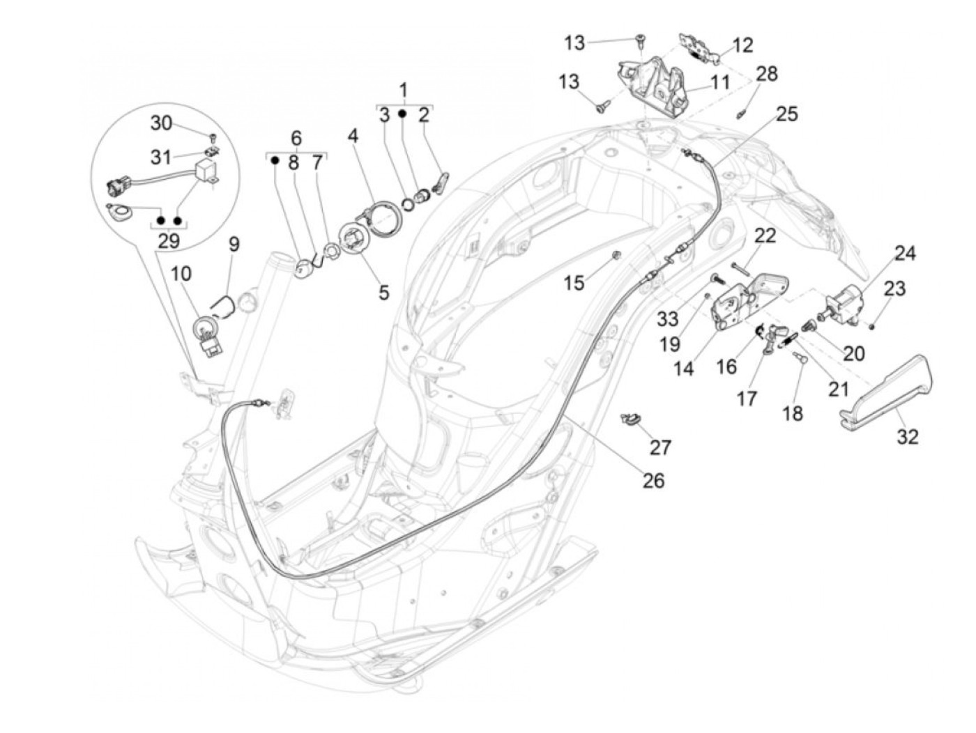 Kunci bangku kursi -PIAGGIO- Vespa GT 250 (ZAPM45102), Vespa GT L 125 (ZAPM31100, ZAPM31101), Vespa GT L 200 (ZAPM31200), Vespa GTS 125 (ZAPM31300, ZAPMA3100, ZAPMA3200, ZAPMA3700), Vespa GTS 150 (ZAPMA3200, ZAPMA3100), Vespa GTS 250 (ZAPM45100, ZAPM45101