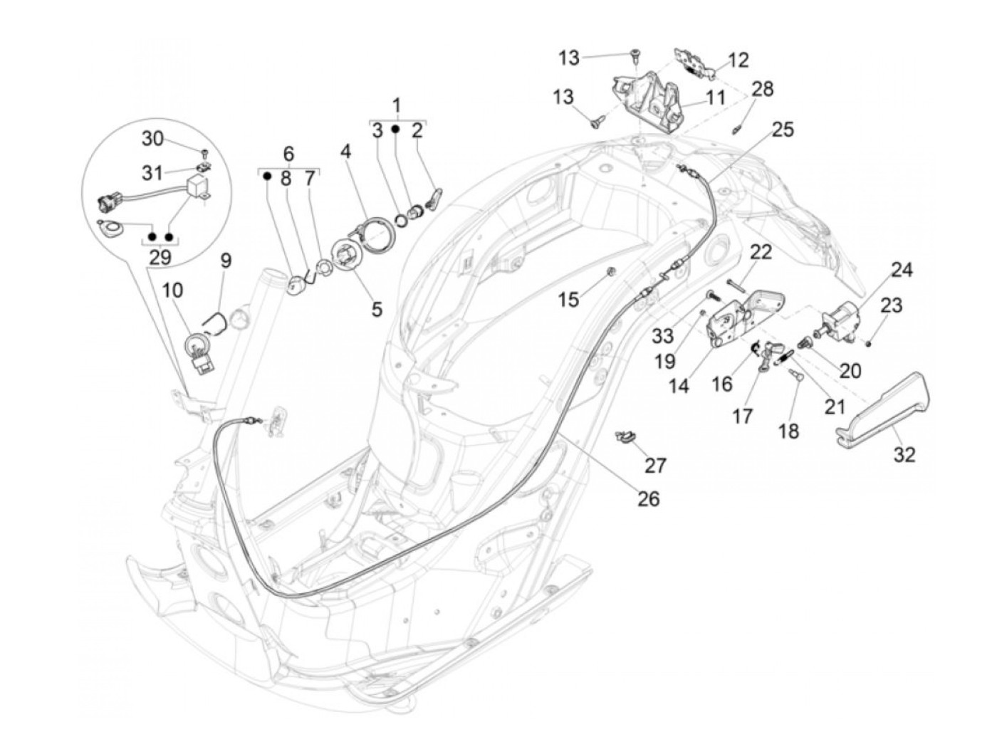 Kunci bangku kursi -PIAGGIO- Vespa GT 250 (ZAPM45102), Vespa GT L 125 (ZAPM31100, ZAPM31101), Vespa GT L 200 (ZAPM31200), Vespa GTS 125 (ZAPM31300, ZAPMA3100, ZAPMA3200, ZAPMA3700), Vespa GTS 150 (ZAPMA3200, ZAPMA3100), Vespa GTS 250 (ZAPM45100, ZAPM45101