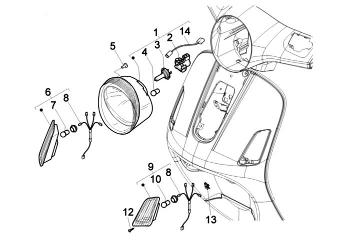 Lampu depan, tanpa lampu parkir, lalu lintas kanan -PIAGGIO- Vespa GTS 150 (ZAPMA3200, ZAPMA3100), Vespa GTS 250 (ZAPM45100), Vespa GTS Super 125 (ZAPM45300, ZAPMA3100, ZAPMA3200, ZAPM45301), Vespa GTS Super 300 (ZAPM45200, ZAPM45202, ZAPMA3300)