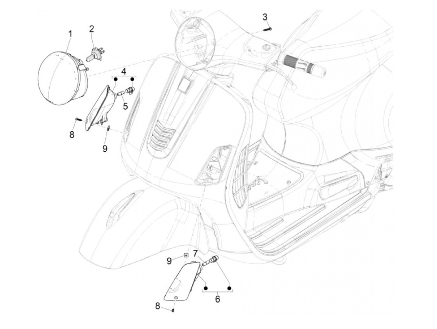 Lampu depan, tanpa lampu parkir, lalu lintas kanan -PIAGGIO- Vespa GTS 150 (ZAPMA3200, ZAPMA3100), Vespa GTS 250 (ZAPM45100), Vespa GTS Super 125 (ZAPM45300, ZAPMA3100, ZAPMA3200, ZAPM45301), Vespa GTS Super 300 (ZAPM45200, ZAPM45202, ZAPMA3300)