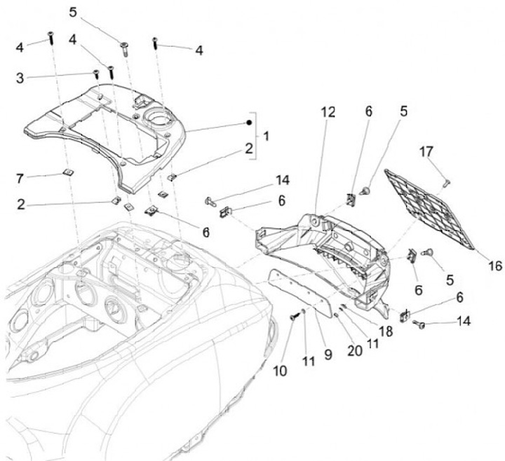 Penutup di belakang kompartemen helm -PIAGGIO- Vespa ET4 (ZAPM04, ZAPM19, ZAPC26), Vespa LX (ZAPC38, ZAPM44, ZAPM68), Vespa LXV (ZAPC38, ZAPM44, ZAPM68), Vespa S (ZAPC38, ZAPM44, ZAPM68)